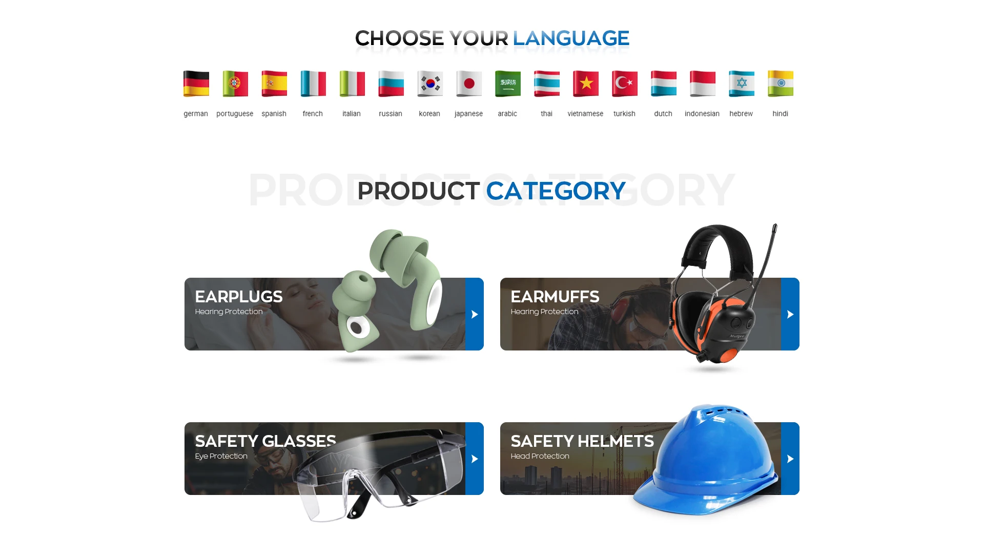 Main categories: Safety Earplug, Safety Helmet, Respirator, Safety Glasses, Safety Earmuff